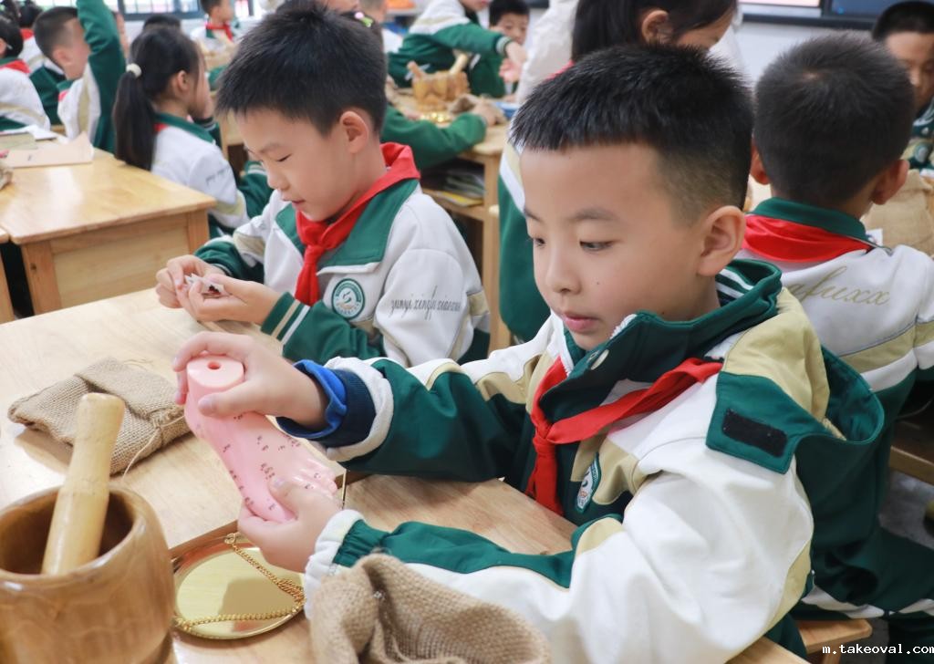 在三年级的课堂上,一场别开生面的中医药文化体验活动—制作中药足浴包也在同时进行中。现场,服务队的师生将川芎、艾叶、桂枝、侧柏叶等药材有序摆放,并详细讲解几味中药的功效,让孩子们现场闻味辨认。孩子们学习了杆秤和捣药钵的使用方法后,化身“小小中医师”,完成了抓药、配比、称重、包药的完整传统中医配药流程,亲手制作了足浴包。